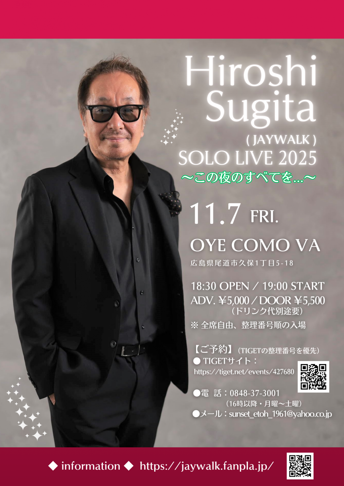 ●TIGETサイト / 電話 / メール〇TIGET:https://tiget.net/events/427680